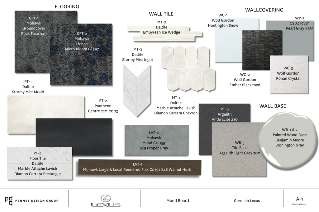 Mood boards and finish palettes become essential tools at this stage. They allow the team to explore material relationships, contrast, and tone while testing how individual elements work together as a system rather than in isolation. Flooring, wall finishes, ceilings, millwork, and work surfaces are all considered together to ensure consistency throughout the space.